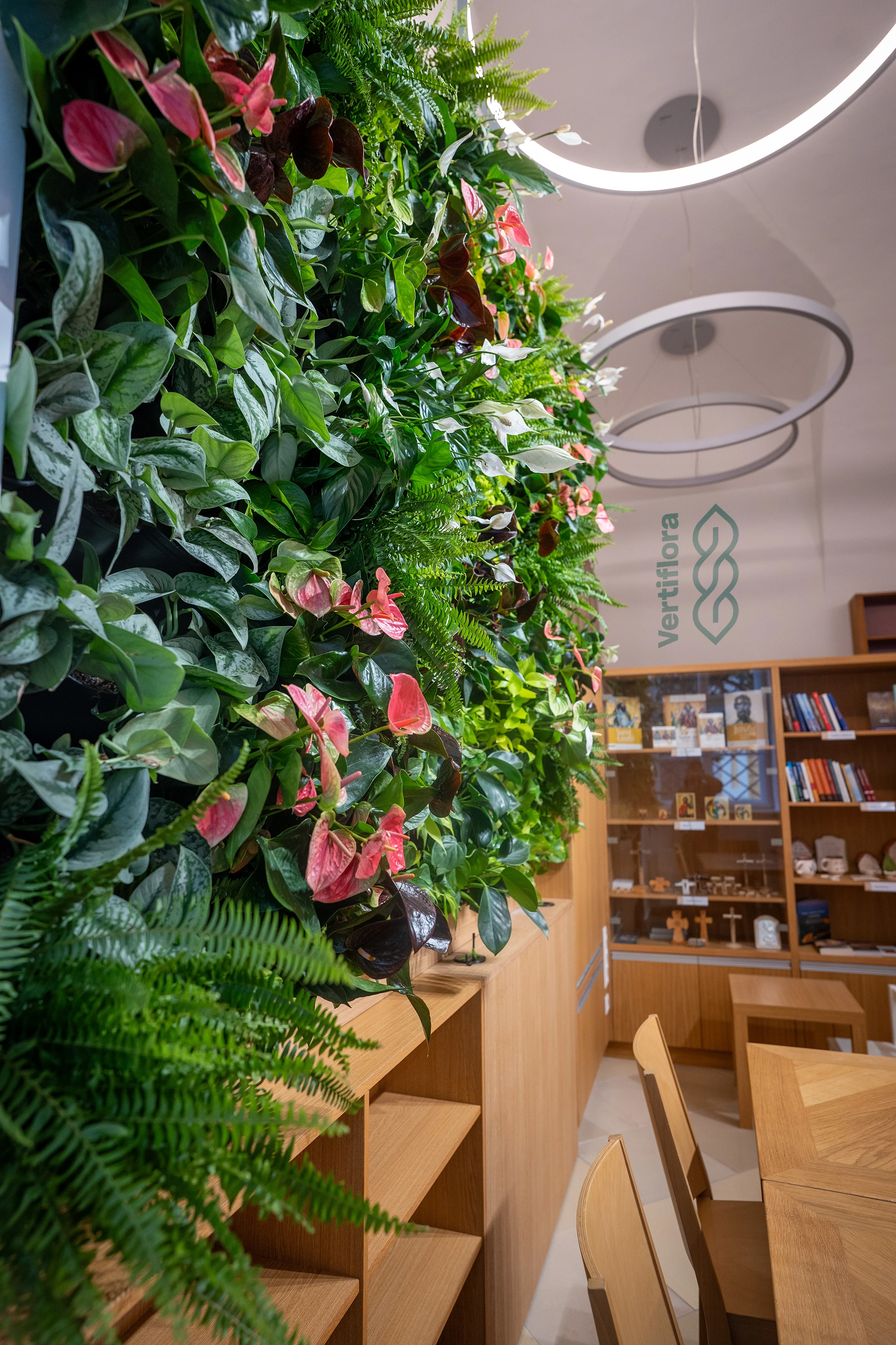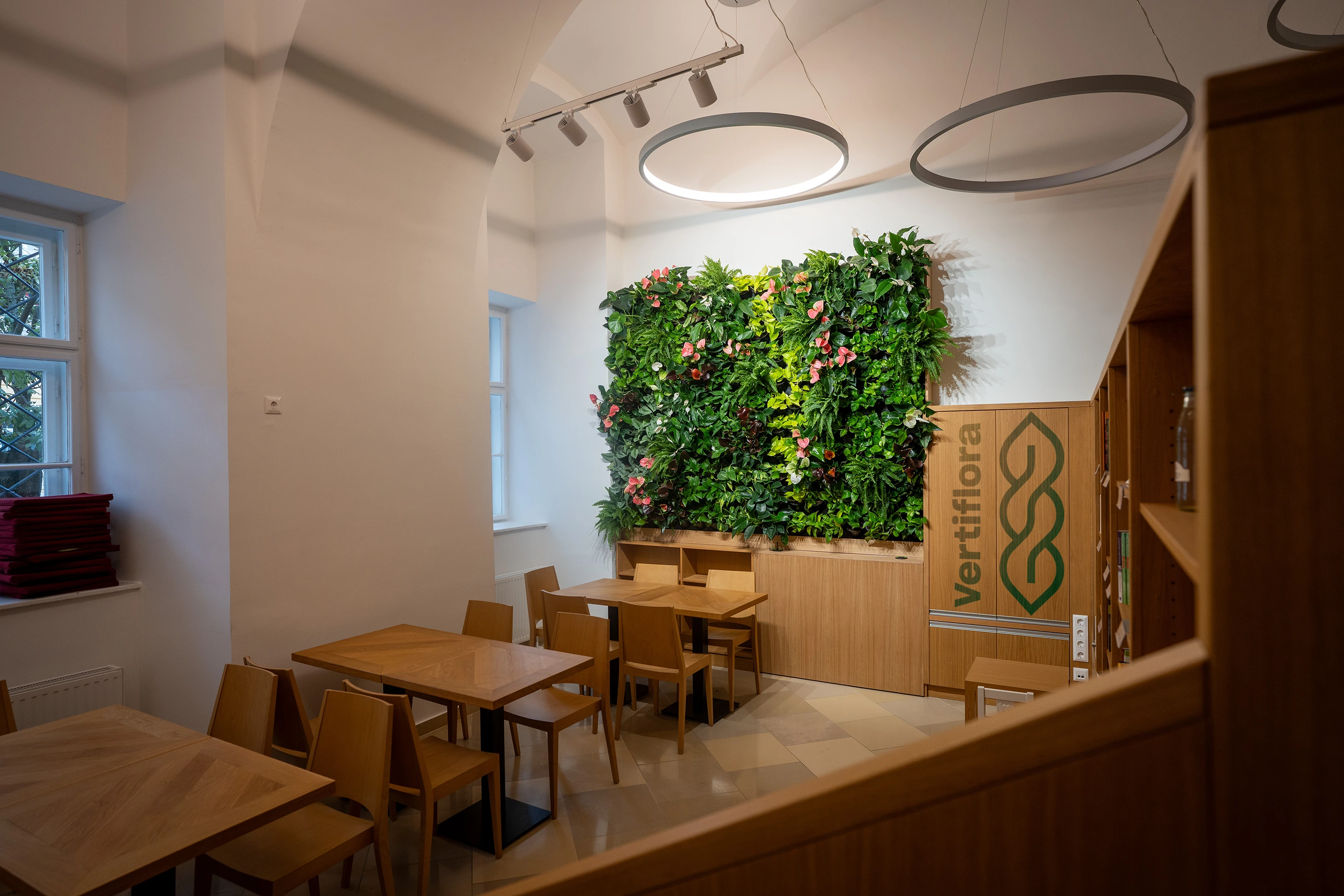 Egyedi megoldásaink közül ez a projekt különösen közel áll a szívünkhöz: egy Vertiflora zöldfal épült a Székesfehérvári Püspöki Palota elegáns, Barátok kávézójába.