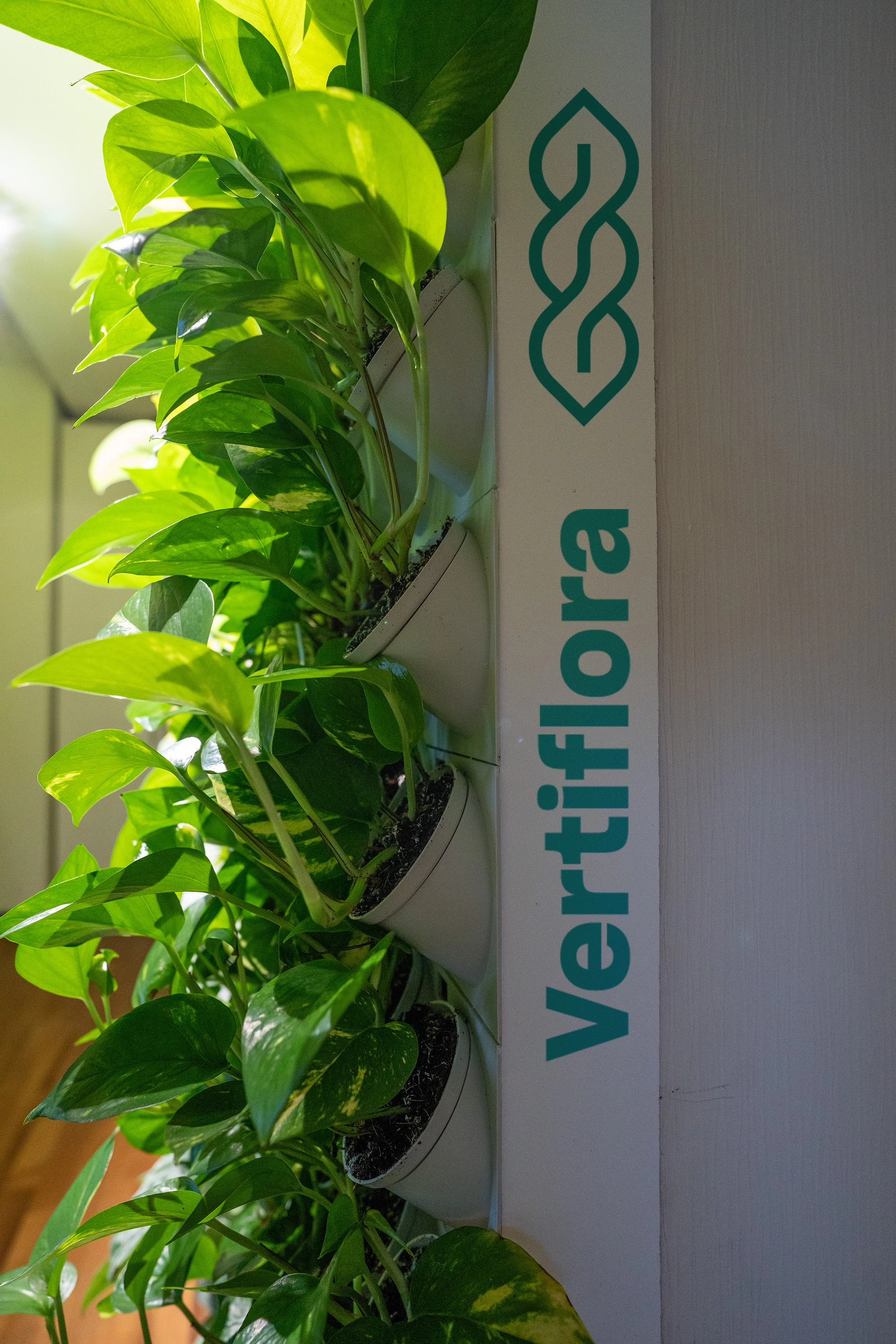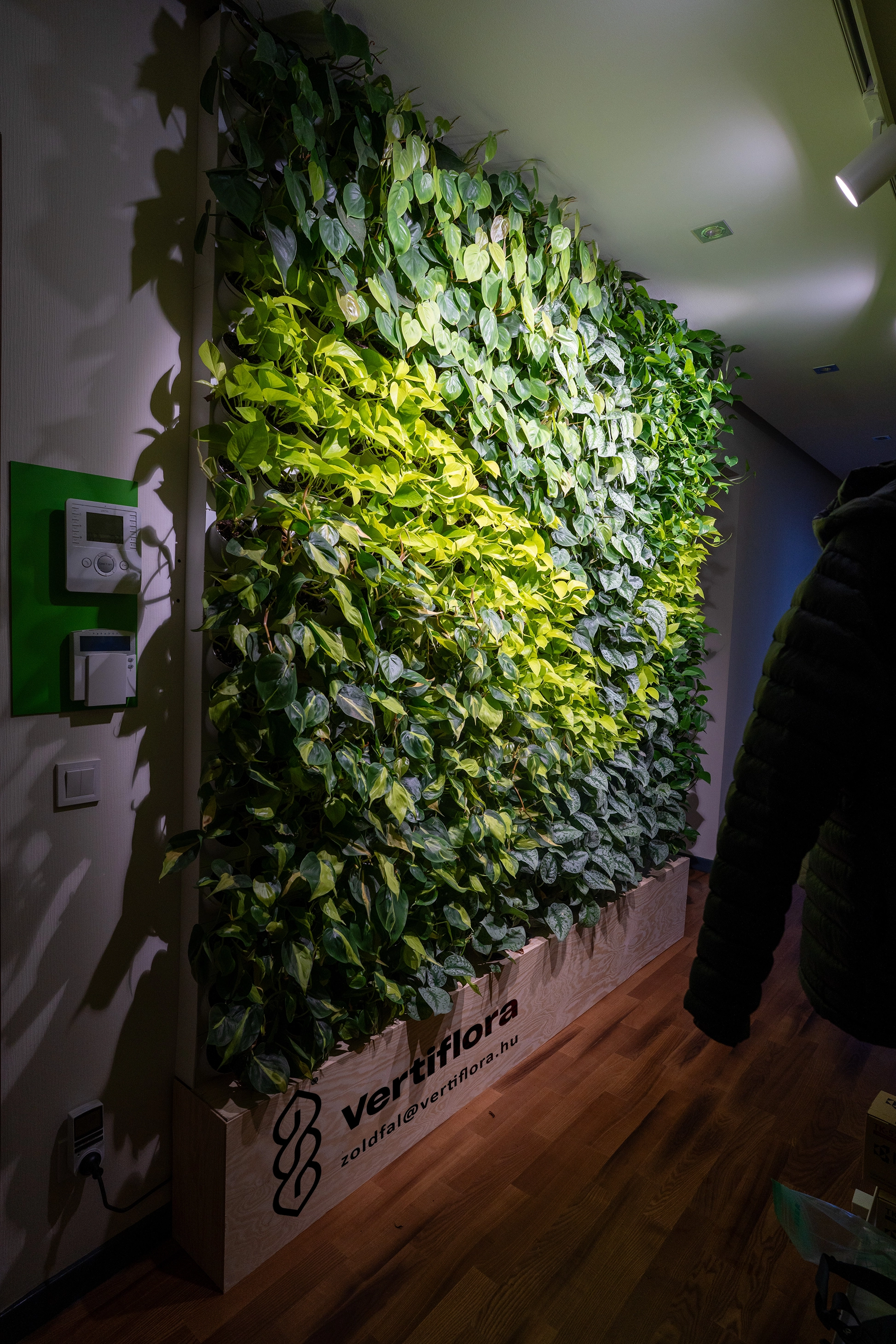 A folyosó mérete miatt különösen fontos volt, hogy a növényfal minél kevesebb helyet foglaljon. Ezért ide a kisebb kaspós rendszerünket telepítettük, amely szerkezetileg mindössze 12 cm mélységű, ehhez adódik hozzá a növényzet néhány centiméteres kiállása.