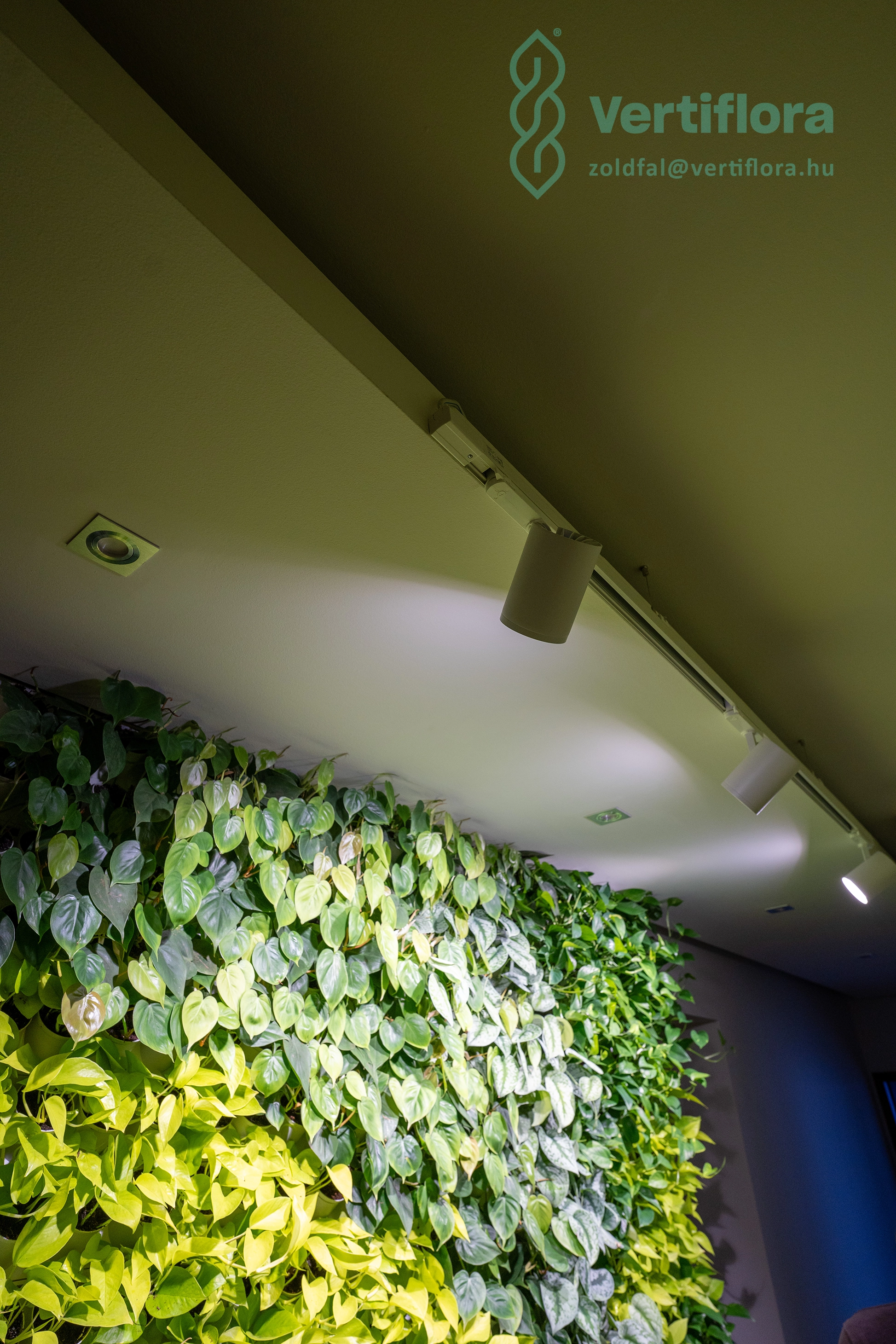 A folyosón egyáltalán nincs természetes fény, ezért a növényfal speciális, professzionális növényvilágítást kapott. Ezek a lámpák a növények számára szükséges teljes fényspektrumot biztosítják, így a növényfal akkor is egészségesen fejlődik, ha a helyiségben nincs ablak.